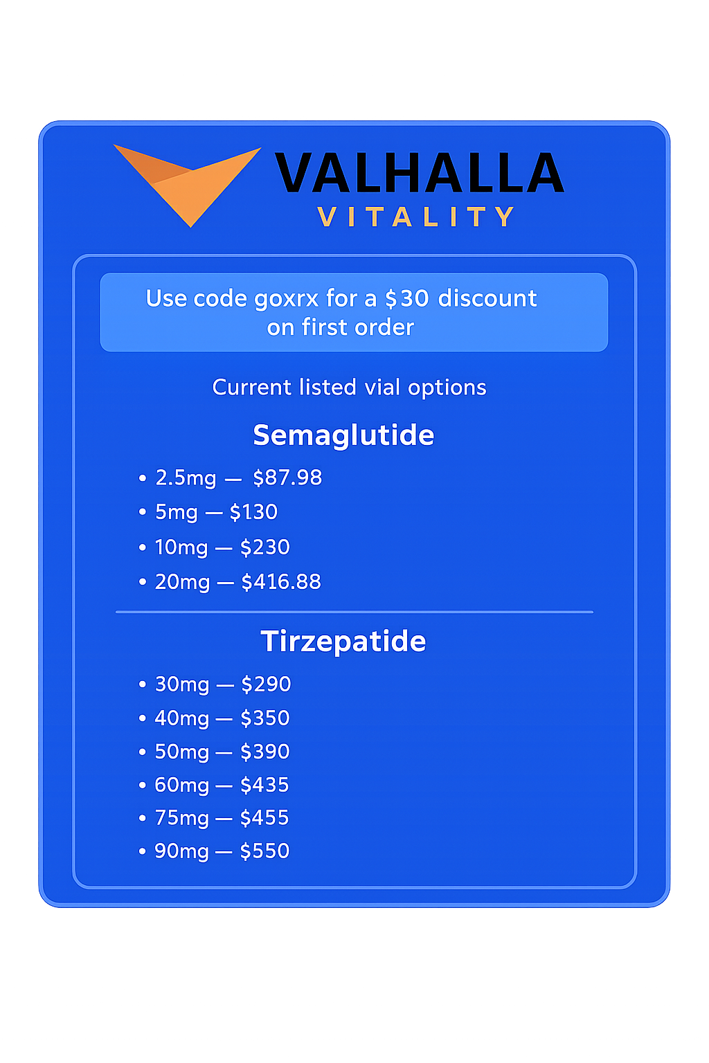 Valhalla offers semaglutide and tirzepatide options, with pricing that varies by formulation, vial size, concentration, and dosage level. Their platform is built around flexibility, giving patients multiple treatment paths depending on their needs and eligibility, while keeping the process online and relatively streamlined.